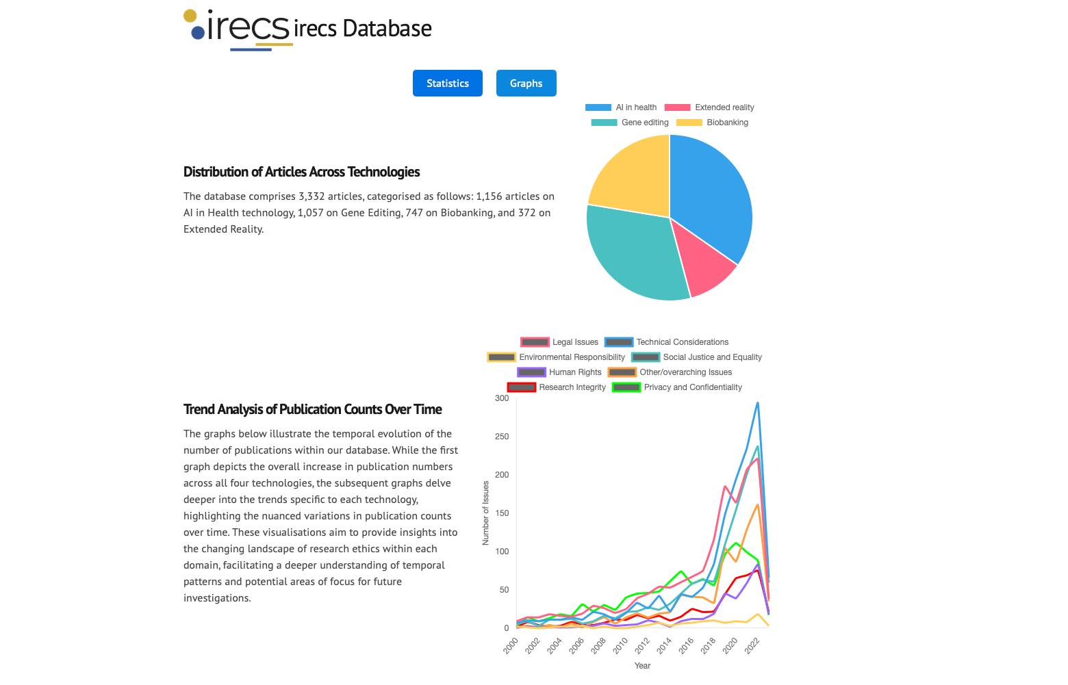 The irecs literature database provides a curated collection of metadata of articles on ethical challenges and research ethics related to the four technologies of focus of the project, i.e., gene editing, biobanking, Extended Reality, and AI in health and healthcare. It constitutes a valuable resource for researchers in technology ethics and law, research ethics reviewers, and ethics experts and helps to identify trends, explore ethical dilemmas, and asses ethical and legal frameworks within specific technological domains.